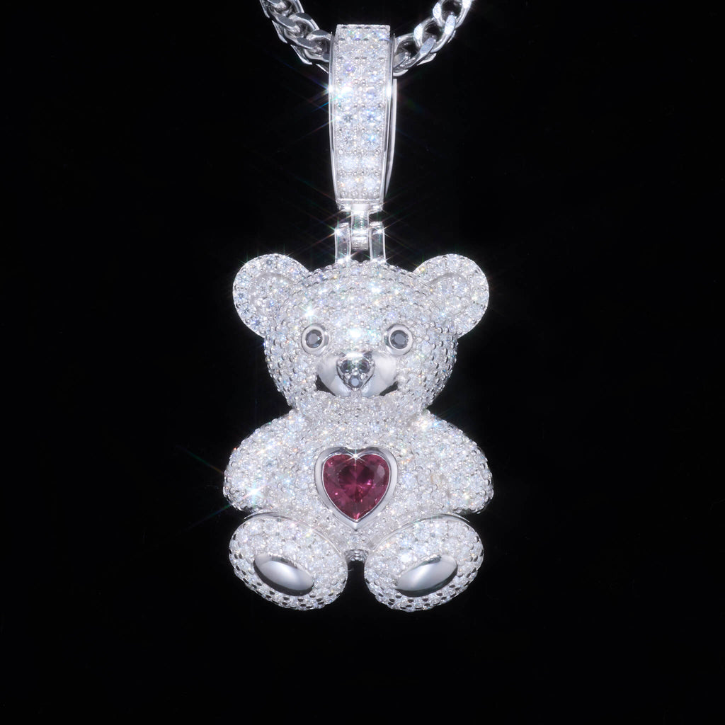 Embrace the playful elegance trend with this sweetheart bear pendant, lavishly paved with moissanites boasting diamond-tier fire (2.65 RI) yet at a fraction of the cost. Centered by a vibrant red zircon heart, it symbolizes love and joy. Crafted in hypoallergenic S925 silver armor, it defies tarnish, water, and skin sensitivities, suspended from a twisted rope chain for timeless appeal. Wear your whimsy—sparkle fearlessly.