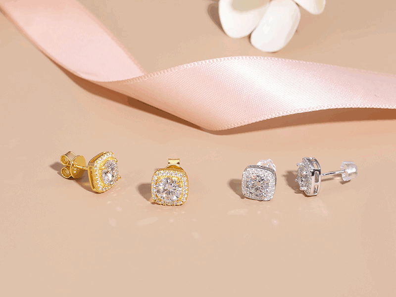 【Square Halo Stud Earrings】Made of one big stone surrounded by a circle of small stones. This design makes the stone very shiny and also means that you shine in the crowd.