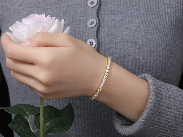 - 【Hypoallergenic Tennis Bracelet 】Unlike the cheap stainless steel bracelets, our tennis bracelet metal are made of 18K white/yellow gold plating 925 sterling silver. All the metals we use are lead-free, nickel-free and hypoallergenic, which are suitable for almost all sensitive skins. These silver studs will not turn your skin green, red or itchy.