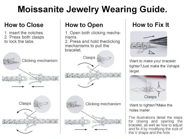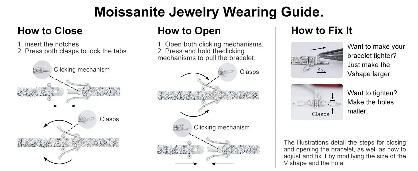 - 【Double Hook Snap-Safety Clasp】Our Ucciyo moissanite tennis bracelet combining safety and fashion. The safety closure design is easy to operate, ensuring that the bracelet is firmly fixed in place while providing a seamless appearance. The important thing is that this is more sturdy than adjustable clasp, don't worry about moissanite gemstones falling off or clasp losing easily.