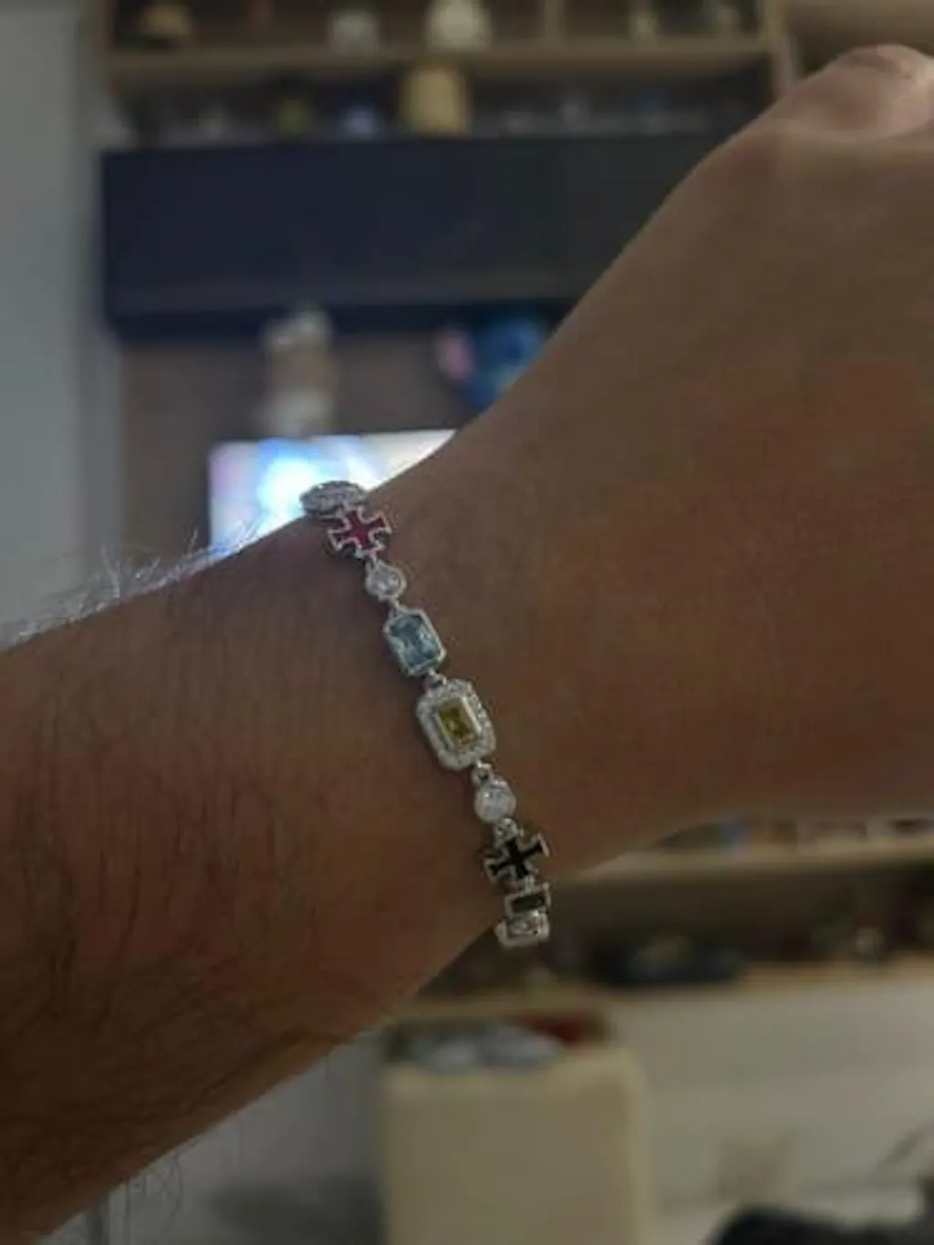 Crafted from high-quality 925 sterling silver, this 7mm tennis bracelet is in a league of its own. Adorned with stunning white moissanite gems and colorful cz stones, it boasts a striking enamel cross for a bold, street style look. A must-have statement piece that's sure to turn heads.